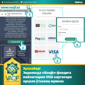 Хушхабар! Эндиликда «Вақф» фондига маблағларни VISA карталари орқали ўтказиш мумкин