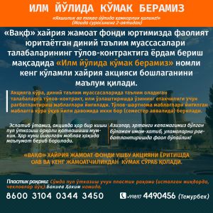 “Vaqf” xayriya jamoat fondi yurtimizda faoliyat yuritayotgan diniy ta’lim muassasalari talabalarining to‘lov-kontraktiga yordam berish maqsadida “Ilm yo‘lida ko‘mak beramiz” nomli keng ko‘lamli xayriya aksiyasi boshlaganini ma’lum qiladi.