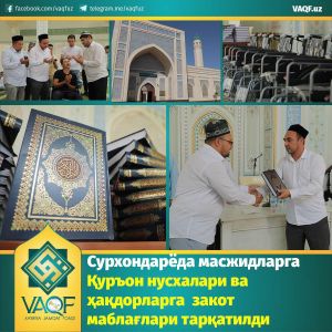 Surxondaryoda masjidlarga Qur’on nusxalari va haqdorlarga zakot mablag‘lari tarqatildi.