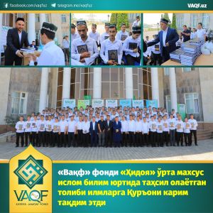 "Vaqf" fondi "Hidoya" o'rta maxsus islom bilim yurtida tahsil olayotgan tolibi ilmlarga Qur'oni karim taqdim etdi
