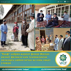 “Вақф” хайрия жамоат фонди Жиззах вилоят филиали кам таъминланган оилаларга кийим-кечак ва озиқ-овқат улашди