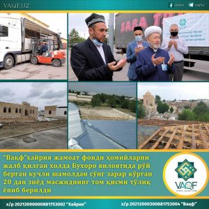 “Вақф”хайрия жамоат фонди ҳомийларни жалб қилган холда Бухоро вилоятида рўй берган кучли шамолдан сўнг зарар кўрган 21 та масжиднинг том қисми тўлиқ ёпиб берилди.
