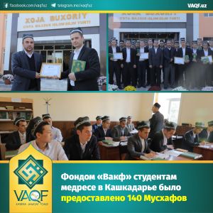 Фондом "Вакф" студентам медресе в Кашкадарье было предоставлено 140 Мусхафов