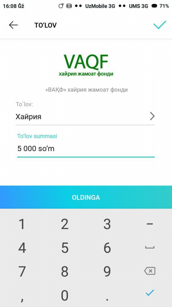 «Олдинга» тугмасини босиш орқали тўлов тасдиқланади